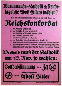 Hitler war also irgendo richtig krank und hatte als Angst-Patient in seiner Kindheit schwere Schuld- und Minderwertigkeitsgefühle.  Diese waren die Folge von Vorwürfen und Kränkungen.  Kompensatorisch entwickelte sich daraus ein Größenwahn, wie er auch bei  Nietzsche auftrat. Hitler ging aber, im Gegensatz zu dem Denker, nicht an seinen Schuldgefühlen zugrunde. Bemerkte Hitler als Erwachsener überhaupt noch bei sich Schuldgefühle? War sein Größenwahn so gefestigt, dass er für das Leid „von Gegnern“ gefühllos war? Liest man sein Buch „Mein Kampf“, staunt man über einen anfangs durchgehenden politischen Realitätssinn gepaart mit einer autistoiden Gefühllosigkeit. Und Gott wird vom Führer hergeholt, wo immer es geht: „Allmächtiger Gott, segne dereinst unsere Waffen… Herr, segne unseren Kampf!“ Er verband sich mit dem Vatikan über das Reichskonkordat. Es erlaubt der Gesitlichkeit bis heute (!)  fundamentalistische Lehre an deutschen Schulen. Im Gegenzug mag man sich mit Hitlerkritik zurückgehalten zu haben. Der Führer wurde nicht exkommuniziert und das bei reichlichem  Wissen des Vatikan über den Holocaust.